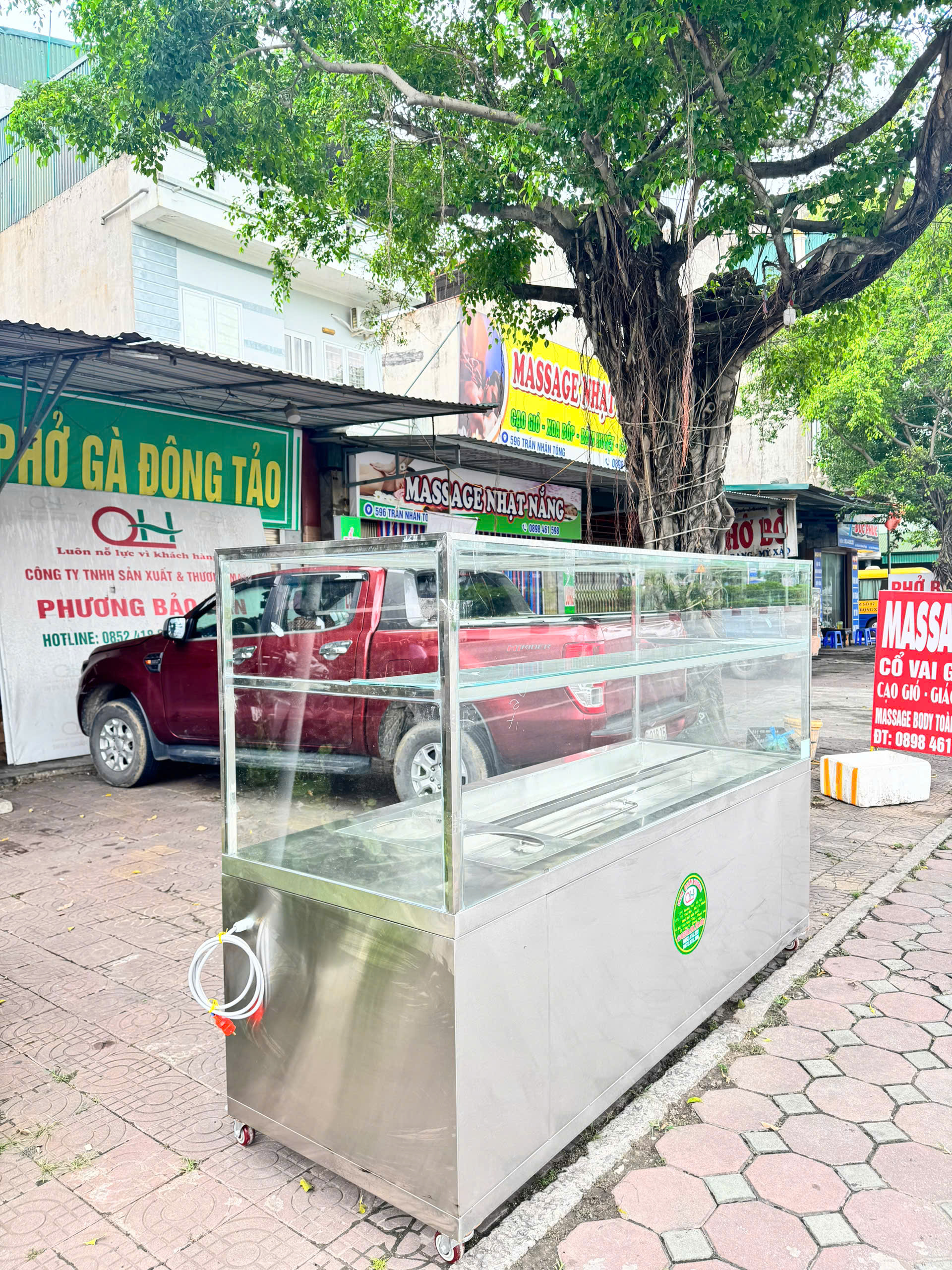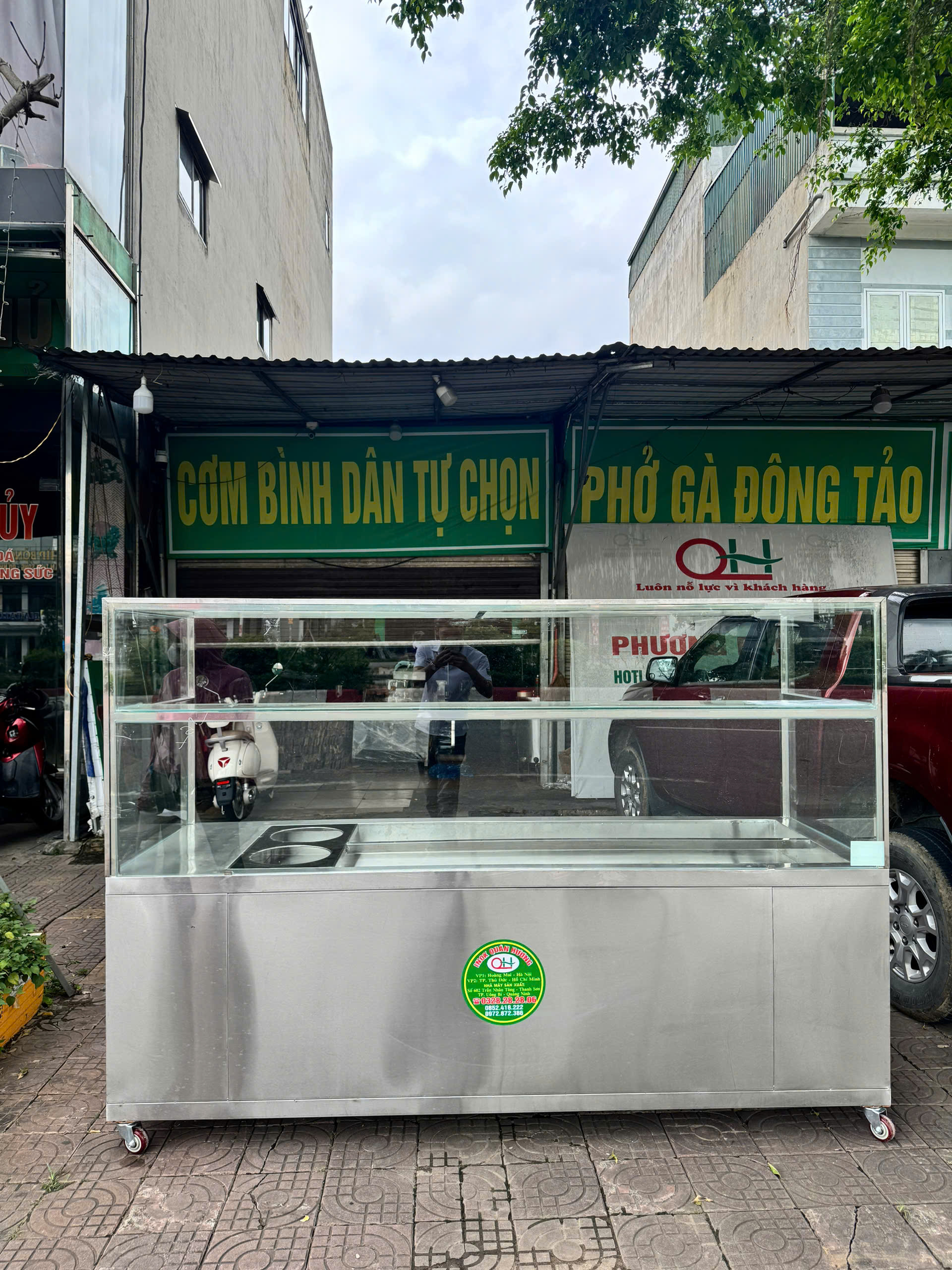 Thiết kế gọn gàng theo chiều dài, phù hợp đặt sát tường hoặc khu vực bán hàng, thuận tiện cho thao tác lấy món và phục vụ.