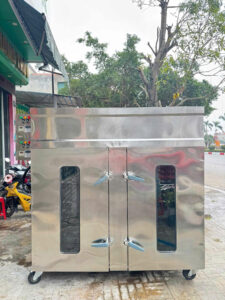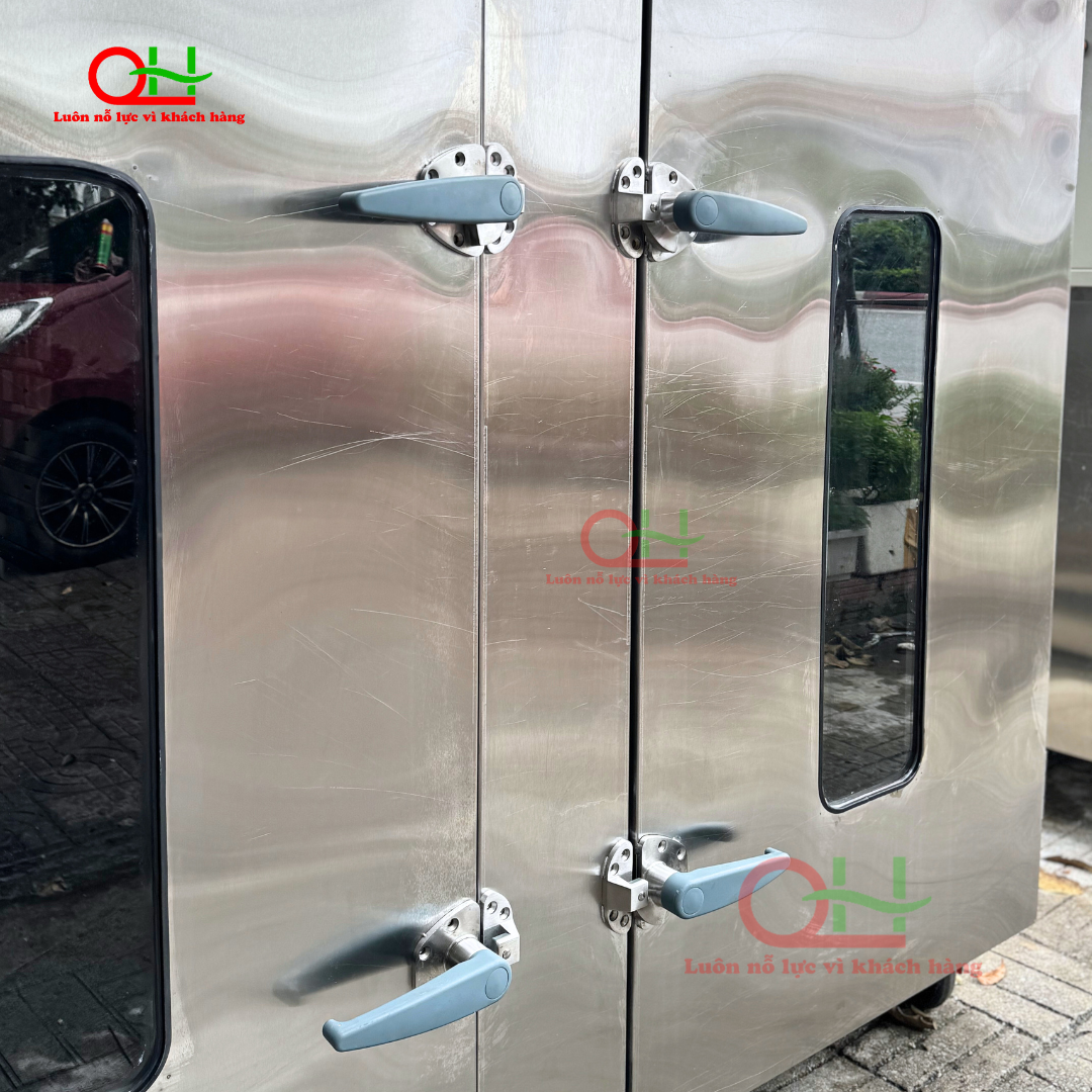 Chất liệu inox cao cấp: Toàn bộ thân tủ được làm từ inox chống gỉ, dễ vệ sinh, đảm bảo an toàn vệ sinh thực phẩm.
